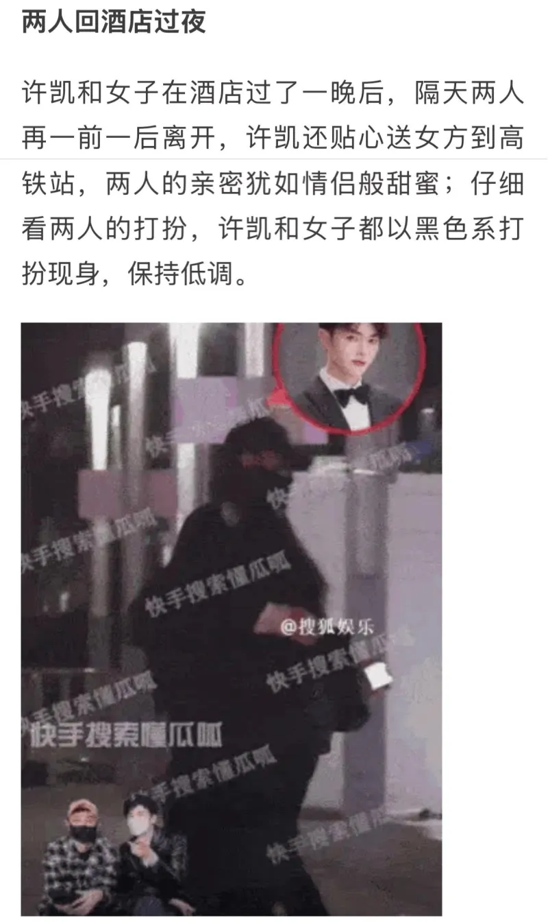 2月,许凯在青岛拍戏期间劈腿新女生,谎称“自己在戒酒、运动”;同月许凯进新剧组,借选角团队约见同组女演员,把女生带到商k会所一起喝酒,酒后带回酒店套房继续饮酒。当晚在他朋友的帮助下,许凯企图再次利用“酒后”与演员发生亲密行为,但女方逃脱。
